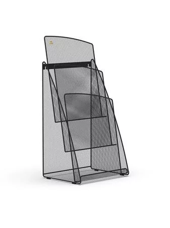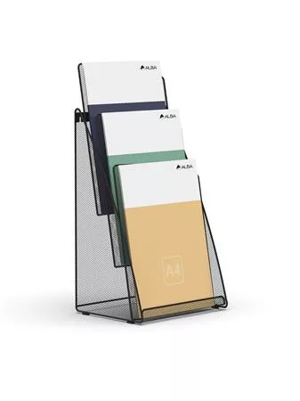 Praktikus és elegáns fekete fémhálós asztali prospektustartó, ideális irodákba, recepciós pultokhoz, várótermekbe vagy bemutatóterekbe — bármilyen környezetbe, ahol fontos a dokumentumok áttekinthető, rendezett elhelyezése és professzionális megjelenítése.