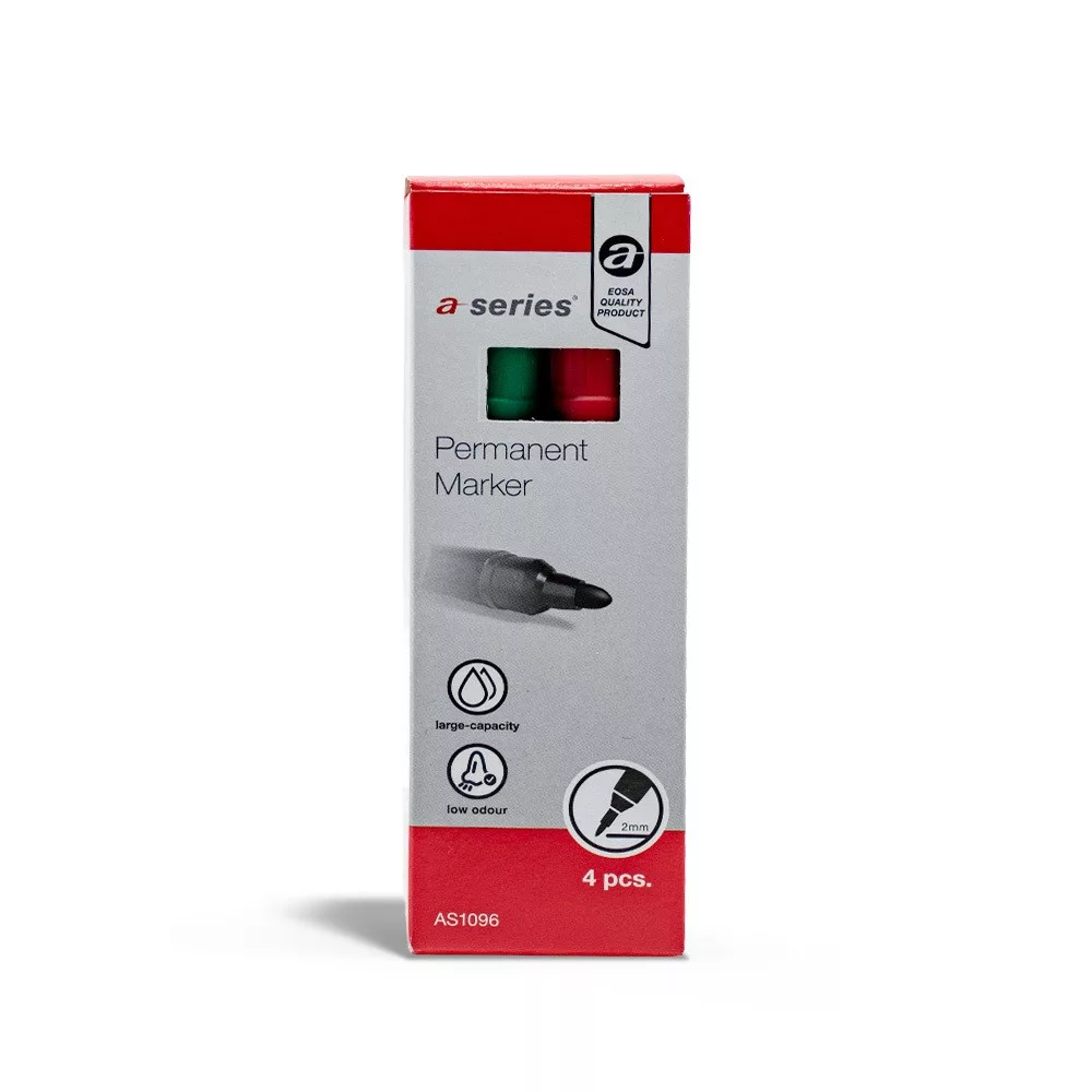 "Műanyag, üveg, fém, fa, illetve szinte minden felület feliratozására, jelölésére alkalmas, alkoholbázisú festékkel töltött permanent marker vastag írócsúccsal. A kerekített csúcs vonalvastagsága: 3 mm. Írásképe gyorsan száradó, vízálló, fény- és kopásálló. Írásképe vízálló, kerek csúccsal és légmentesen záró kupakkal. Test színe fehér, az írásszín egyértelmű megjelölésével. Készlet írásszínei: kék, fekete,piros,zöld. " Katalóguskód: 63783