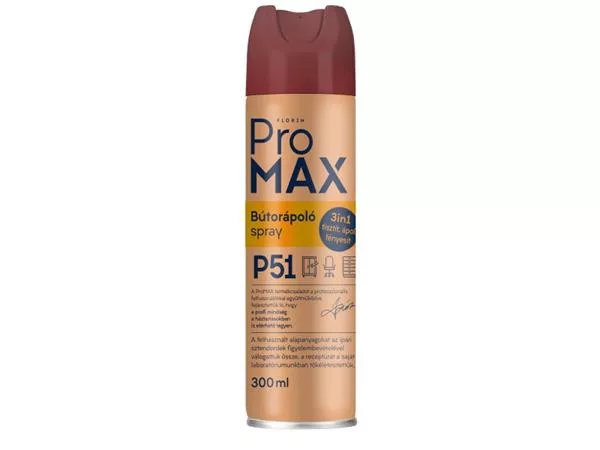 A Promax Bútorápoló spray egy hatékony, gyorsan alkalmazható aeroszolos ápolószer, amely fényesíti, tisztítja és védi a fa és fa jellegű felületeket, miközben megakadályozza a por és a szennyeződések újbóli lerakódását.
