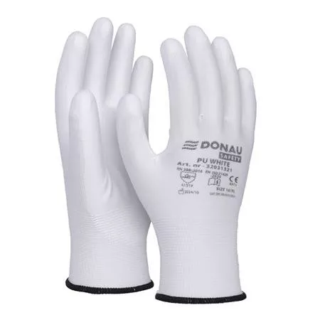 Jó minőségű fehér poliészter kötött anyagból készült kesztyű, fehér poliuretán bevonattal a markolat területén.