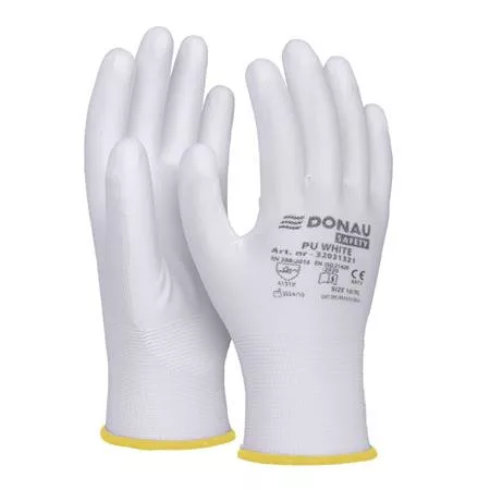 Jó minőségű fehér poliészter kötött anyagból készült kesztyű, fehér poliuretán bevonattal a markolat területén.