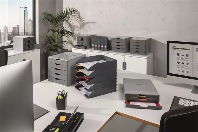 5 db elegáns irattálcát tartalmazó szett színes kivágással, mely megkönnyíti az iratok közötti keresést.
