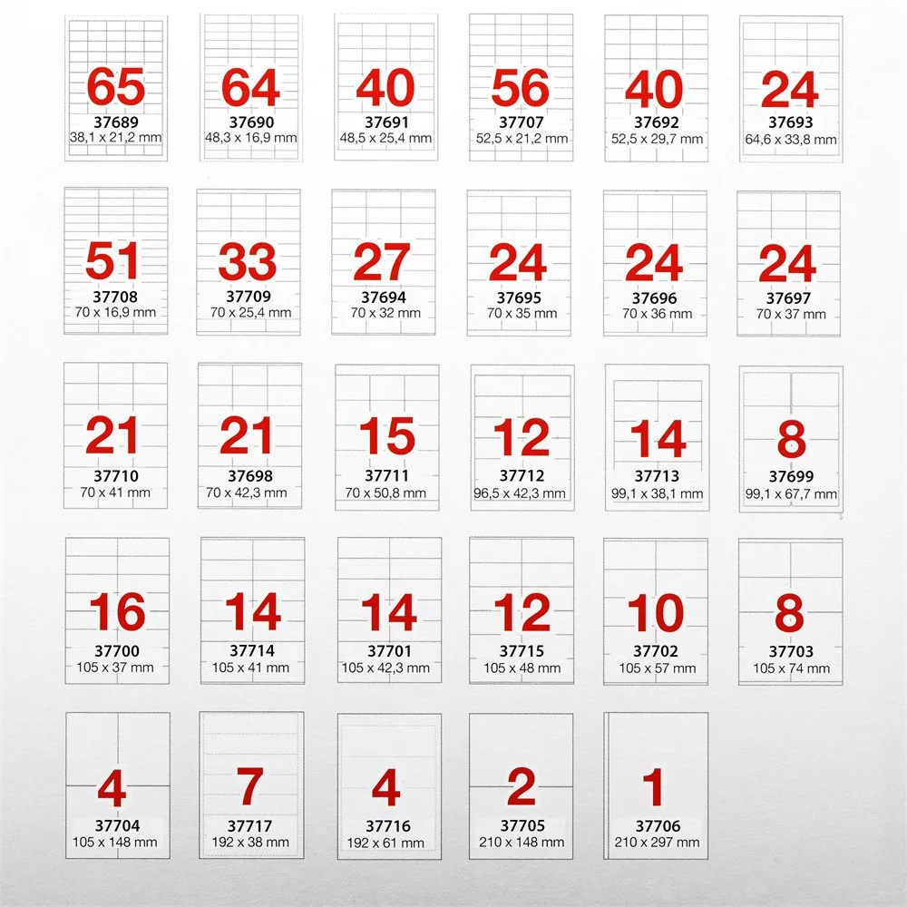 a-series etikett címkék A4-es lapokon. Méretek: 192x61 mm, szín: fehér, anyaga: címkepapír (60 g / m2), ragasztó: öntapadó (tartós ragasztó), címkék csomagonként: 400 darab, lapok csomagonként: 100 lap. Nyomtatható: minden lézer- és tintasugaras nyomtatóval, fénymásolóval, színes lézernyomtatókkal és színes fénymásolókkal. Kivitel: préselt, körbefutó biztonsági él, fehér klímavédő csomagolás. Katalóguskód: 37716