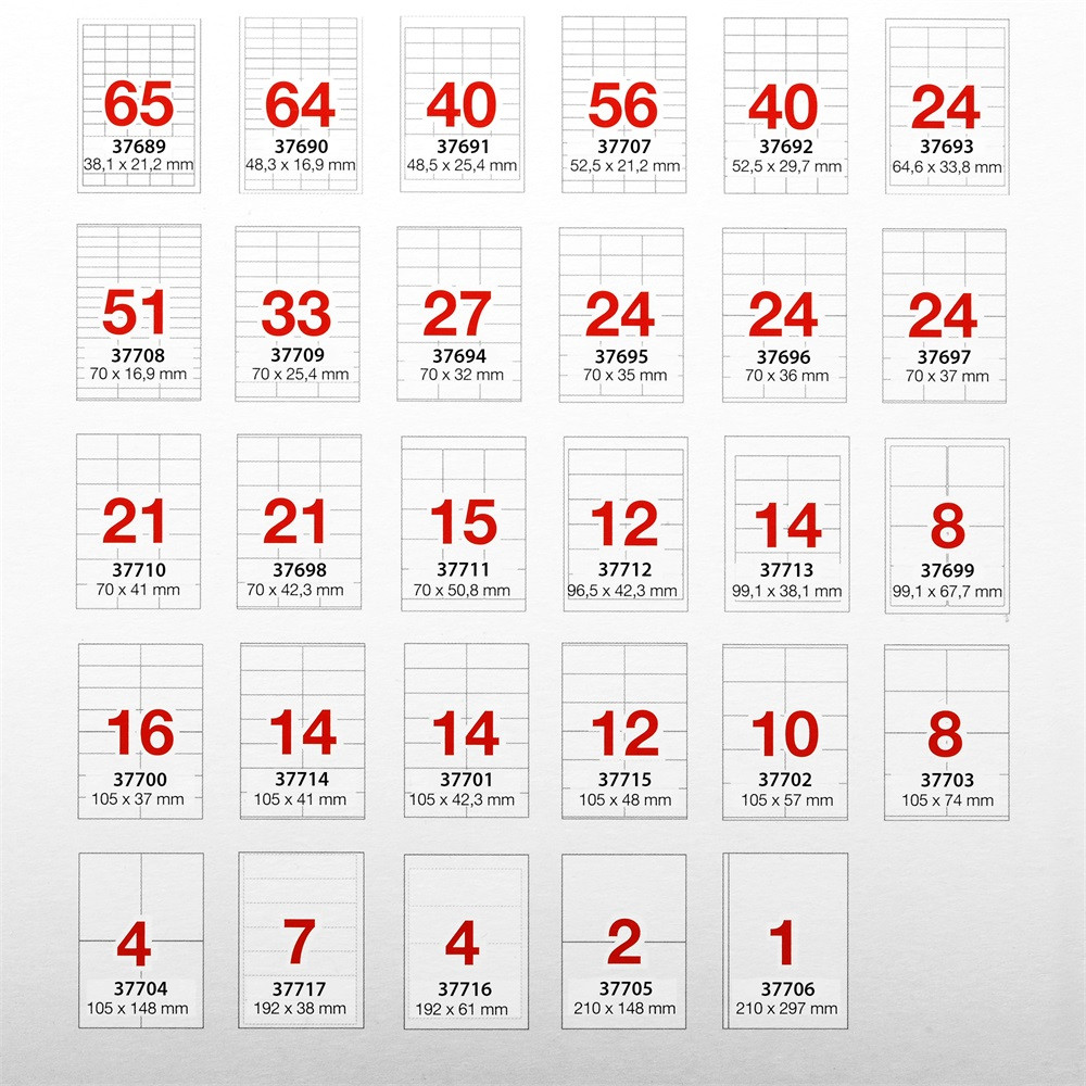 a-series etikett címkék A4-es lapokon. Méretek: 70x25,4 mm, szín: fehér, anyaga: címkepapír (60 g / m2), ragasztó: öntapadó (tartós ragasztó), címkék csomagonként: 3300 darab, lapok csomagonként: 100 lap. Nyomtatható: minden lézer- és tintasugaras nyomtatóval, fénymásolóval, színes lézernyomtatókkal és színes fénymásolókkal. Kivitel: préselt, körbefutó biztonsági él, fehér klímavédő csomagolás. Katalóguskód: 37709