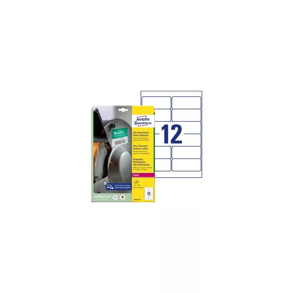 Az Avery Zweckform, fehér, ultra ellenálló film címkéit, lézernyomtatókhoz 99,1x42,3 mm méretben kiemelkedően nagy strapabíróság jellemzi, hogy megfeleljen a legmagasabb követelményeknek bel- és kültéren egyaránt. 120 db felületkezelt, matt, rugalmas polietilén címke, 10 íven.