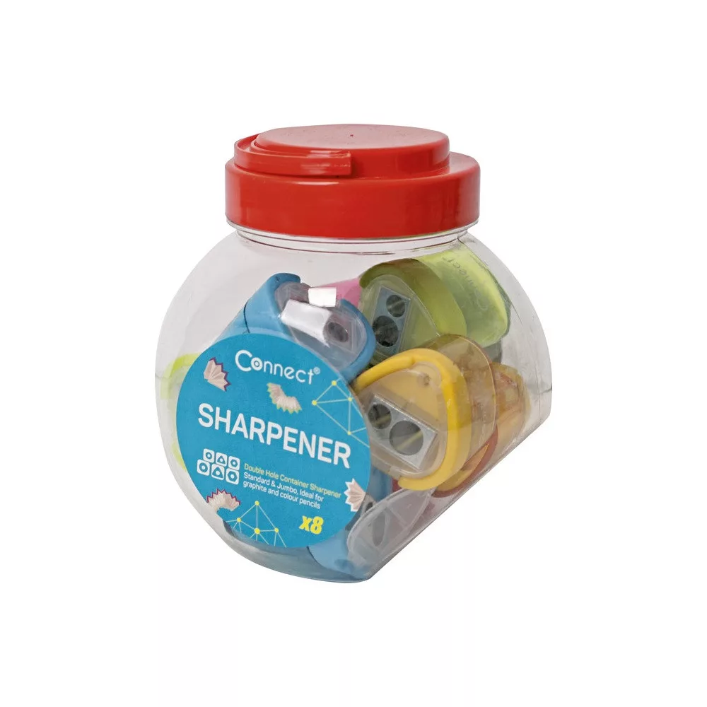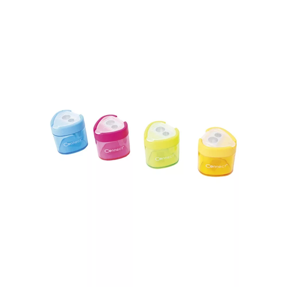 Műanyag fedeles tartályos 2 lyukú hegyező. Normál és jumbo ceruzákhoz. 4 féle vegyes színben. Katalóguskód: 22861