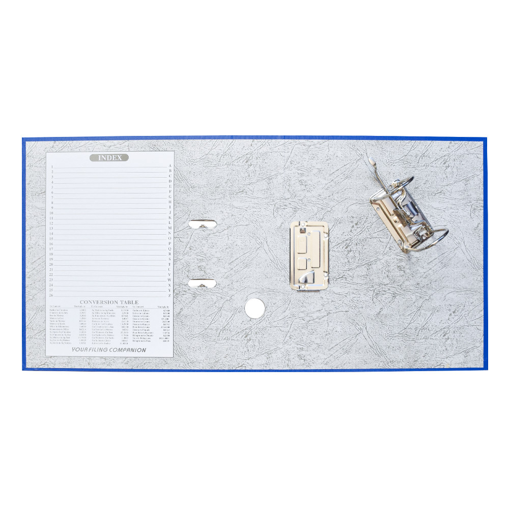 Emelőkaros iratrendező általános használatra. Kívül PP, belül fehér karton borítással, kihúzólyukkal. Cserélhető gerinccímke a feliratozáshoz. Tárolókapacitás 500 lap (A4 80gr.). A terméket lapra szerelve szállítjuk, a mellékelt emelőkaros szerkezet bepattintása gyors és egyszerű, 5 másodperc alatt elvégezhető és iratrendezőnk máris használatra kész! Katalóguskód: 12063