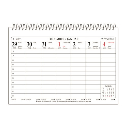 - Naptárbeosztás: heti beosztás, 8-18 óra közötti időbeosztás, magyar név- és ünnepnapok, hónapáttekintő, holdfázisok, eltelt/hátralévő napok száma
