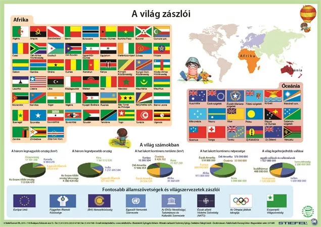 A világ zászlói két oldalas alátétünk segítségével gyermeke szórakozva tanulhat, információkat szerezhet a világ országairól, aktuális geopolitikai felosztásáról. A világ összes, az ENSZ által ma elismert országának zászlója földrészenként csoportosítva látható a terméken, amelyek hitelességét hazánk egyetlen Zászlómúzeumának szakértője, Balogh László vizsgálta meg. A könyöklőn a zászlókon túl egy rendhagyó ábrázolás, hazánk nemzeti lobogójának történelmi fejlődése is látható, továbbá egy érdekes, könnyen érthető statisztikai adathalmaz a világ országainak nagyságáról, népességéről, vallási megoszlásáról… Ez a könyöklő kitűnő ajándék nemcsak az olthatatlan tudásszomjú nebulók, hanem a földrajz vagy a világpolitikai kérdések iránt érdeklődő felnőttek számára is.