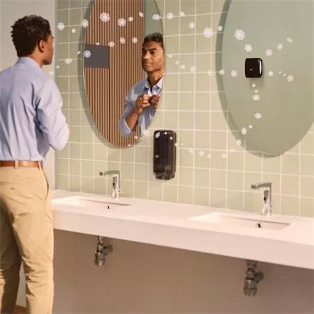 Az Elevation termékcsaládba tartozó Tork folyamatos adagolású légfrissítő adagoló folyamatosan és egyenletesen oszlatja el az illatot.
