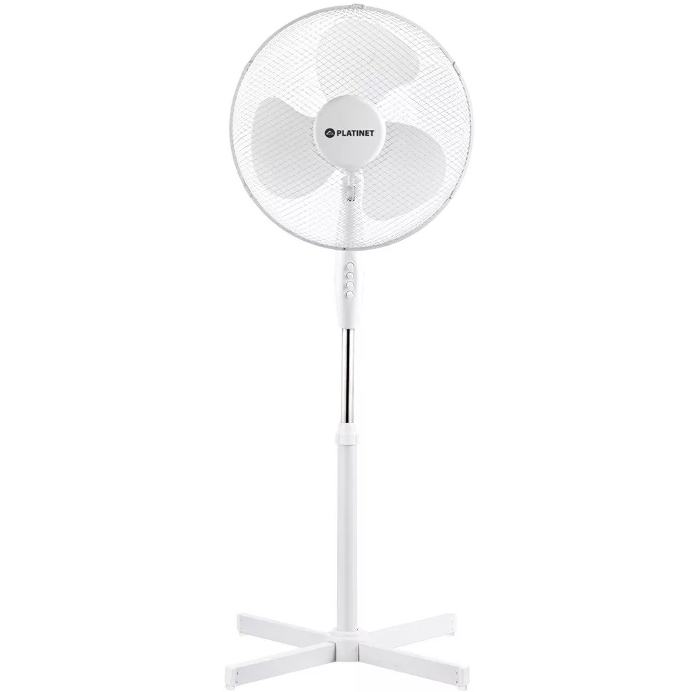 A fehér álló ventilátor stabil, széles talppal (60 cm x 60 cm) rendelkezik, így biztonságosan elhelyezhető különféle sík felületeken, mind az irodában, mind otthon. A teleszkópos, állítható keret akár 120 cm-re is kiterjeszti a készülék magasságát, a három gombbal pedig a ventilátor működését a felhasználó egyéni igényeihez lehet állítani. A 16"-os ventilátor hagyományos csatlakozóval csatlakozik a hálózathoz. A készülék teljesítménye 40 W, ami optimális működés közben gazdaságos energiafogyasztást garantál. Három tartós lapát biztosítja a megfelelő légáramlást, a fémház pedig a biztonságot mozgásuk során. A fehér ventilátor tökéletesen hűti a helyiségeket a forró napokon. Katalóguskód: 67563