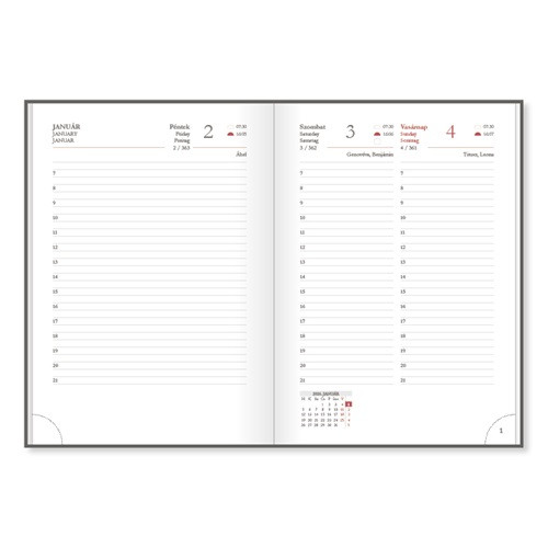 - terjedelem: 352 oldal (16 információs oldal, 320 naptároldal, jegyzetek, telefonregiszter)
